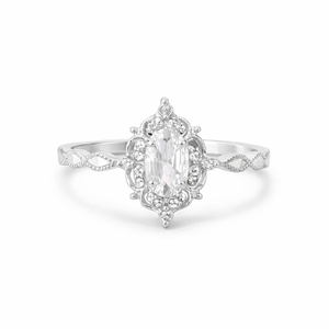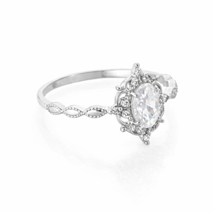 A timeless vintage-inspired oval moissanite ring with delicate milgrain and halo detailing for that classic antique sparkle. The oval center stone is framed by a soft halo of shimmer, while the band features elegant infinity-style filigree accents, giving the ring an heirloom feel with a clean, wearable silhouette.