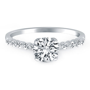 This 14k white gold diamond engagement ring is enlivened by a delicate row of expertly set shared prong diamonds. Each diamond shares a single prong, giving the impression that the diamonds are floating across the top of the band. Let the magic of this ring inspire you as the highly polished surface delights the eye with elegant simplicity. The center highlights a sparkling 1/2 carat round cut diamond.