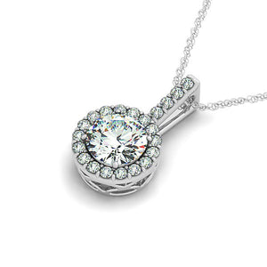 Wonderfully enchanting, this round shape pendant showcases a 1/2 carat center stone with halo diamonds featuring 22 diamonds in total, this beautifully designed in 14k white tone gold.