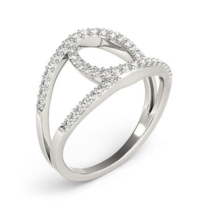 Brilliant round diamonds are pave set on the looping style dual band of this enchanting polished ring. Crafted in high-quality 14k white gold.