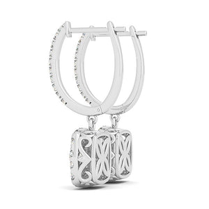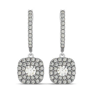 Showcasing pave set upper bar and double halos, these drop style earrings are made of 14k white gold and designed with fleur de lis side elements. Secured with hinged backs.
