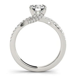 Pave set split style shank in a lovely interlaced design highlights the gorgeously pronged round cut diamond of this engagement ring. Made of 14k white gold.