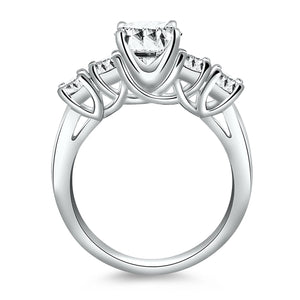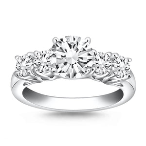 This attractive multi-stone ring glitters with sizeable accent diamonds on either side of the center diamond of this 14k white gold engagement ring.. Graceful crossover prongs achieve an elegant trellis effect The center highlights a sparkling 1/2 carat round cut diamond.