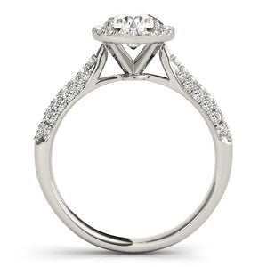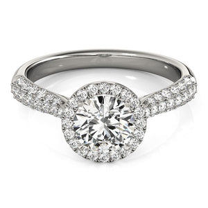 A round halo style diamond ring featuring delicately graduated pave set band stones. Designed in fine 14k white gold.
