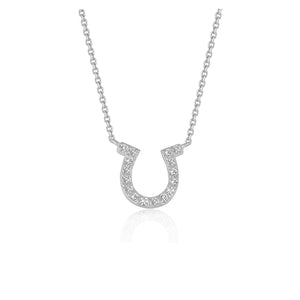 This classic diamond horseshoe design pendant features a 16 inches cable chain. Made of 14k white gold, this comes with a lobster lock.