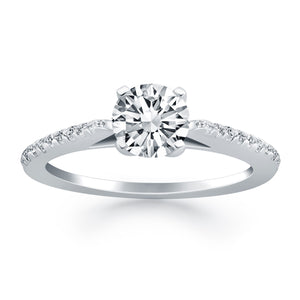 A glittering row of micro prong set diamonds enlivens the slender band of this beautiful streamlined cathedral engagement ring. Expertly crafted in 14k white gold, the center highlights a sparkling 1/2 carat round cut diamond.