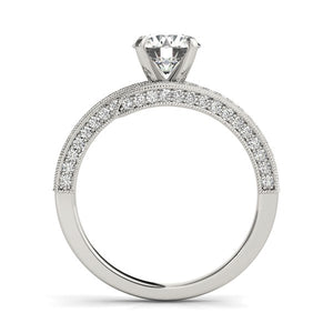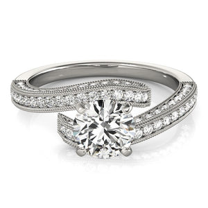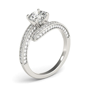 Showcasing, an alluring antique style bypass round diamond ring features pave set stones with textured milgrain detailing. Positively beautiful in 14k white gold.