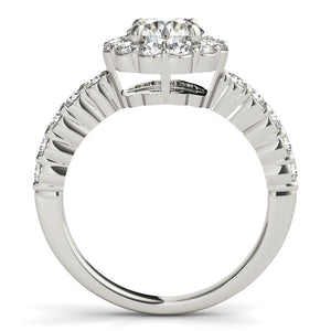 Enchantingly dazzling, this classic round cut diamond engagement ring showcases a beautiful flower-like border and diamonds down the shank. Made of 14k white gold.