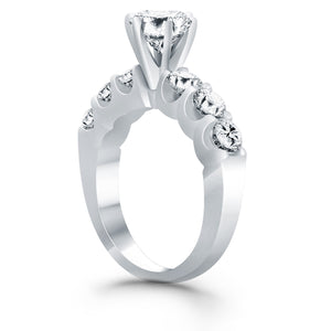 Six glittering accent diamonds in shared prong settings dazzle along the front of this stylish engagement ring mounting. Expertly crafted in 14k white gold, the center setting can be customized to accept a wide range of center stone sizes and shapes. The center highlights a sparkling 1/2 carat round cut diamond.