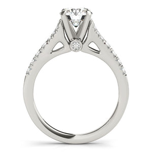 Crafted in fine 14k white gold, this round prong set diamond ring features a split shank design with scallop set single row stones.