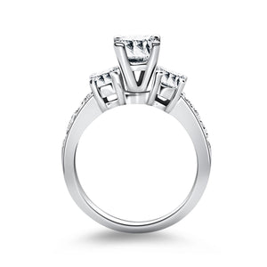 The three stone ring represents the past, present, and future and this sparkling engagement ring with diamond accents along the band captures the motif with style. The center highlights a sparkling 1/2 carat round cut diamond.