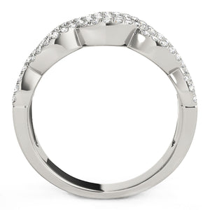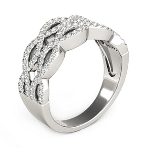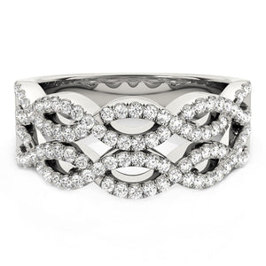 Two pairs of interlocking waves of diamonds, set in 14k white gold, add dynamic energy to this elegant ring.