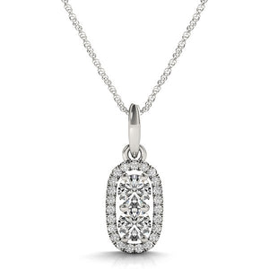 This two stone diamond pendant features a border of smaller sparkling side diamonds. An alluring piece made of 14k white gold.