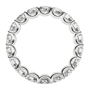 Intriguing curved prongs of glimmering 14k white gold encircle beautiful round cut lab grown diamonds with elegant, arch-like waves of shine in this spectacular eternity ring, adding contrast and organic shape to a traditional setting.