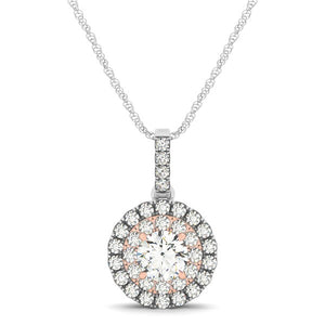 This round shape diamond double halo pendant features a 1/4 carat center diamond surrounded by smaller diamonds. Delightful with a diamond bar style bail, this pendant is made in 14k white and rose gold.